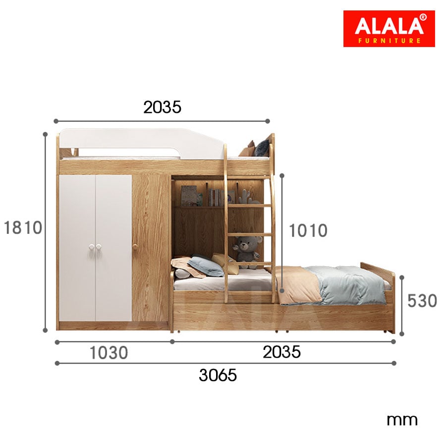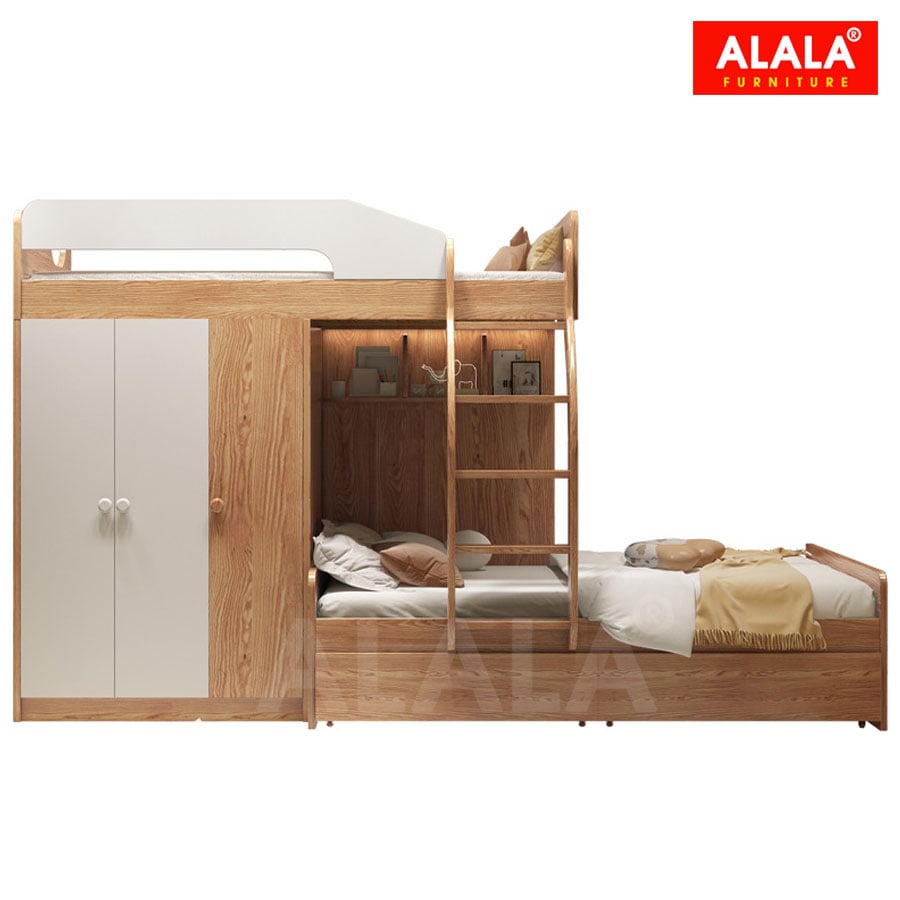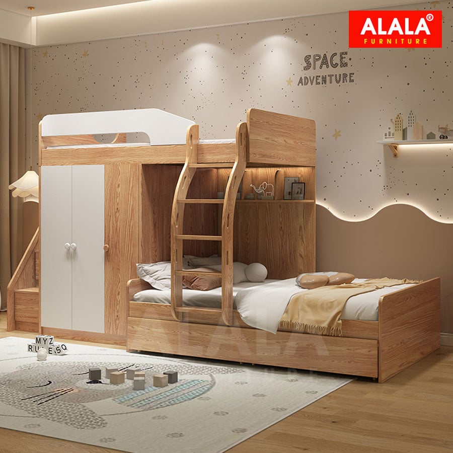 + Giường tầng cao cấp được làm bằng Gỗ ALALA phủ Melamine chống trầy đạt tiểu chuẩn E1 cao cấp nhập khẩu Thái Lan được phủ Melamine chống nước đạt tiêu chuẩn chất lượng xuất khẩu, giúp sản phẩm không chỉ đẹp hơn về mỹ quan mà còn mang lại độ bền chắc lâu dài. Bên mặt được phủ bóng chống hút ẩm, dễ lau chùi và hạn chế trầy xước, độ chịu nhiệt, chịu nước cao. Sản phẩm qua xử lý chống cong vênh, mối mọt bằng công nghệ của Đức, thân thiện và an toàn cho sức khỏe gia đình và môi trường.