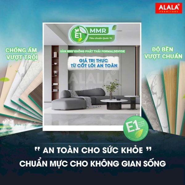 - Chất liệu: Gỗ ALALA đạt tiêu chuẩn E1 nhập khẩu Thái Lan được phủ Melamine chống thấm, bền bỉ và an toàn cho sức khỏe.